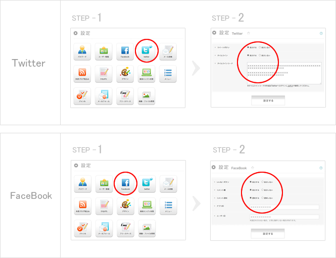 1) 管理画面の設定画面で「ツイッター」「フェイスブック」を選択します。2) それぞれの設定画面で、「表示する」を選択し、必要項目を入力するだけ。
