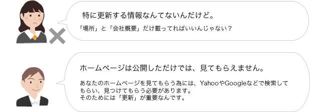| ホームページは作成しただけで終わりではありません。 ホームページは、常に会社概要などの情報を最新に保つ必要があります。キャンペーンやセール、年末年始のお休み情報など、さまざまな情報をホームページに掲載することで、初めて集客に役立つホームページになるのです。 |