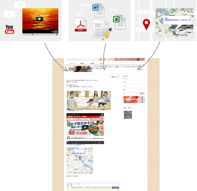 文字を書くことはもちろん、ボタンを押すだけの簡単な操作でYouTubeや、Googleマップ、エクセルなどのファイルも、ページに簡単に掲載できます。
