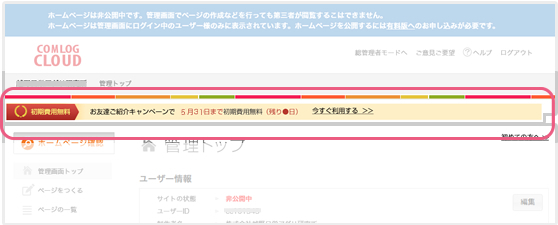 アカウントを作成したら、管理画面にログインし、上部に「初期費用無料」のバナーが表示されていることをご確認下さい。