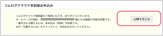 管理画面トップの「有料版お申込み」の中の「公開するには」をクリックします。