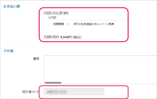 本お申込みフォームの中の金額と、紹介者コードが入力されていることをご確認いただき、