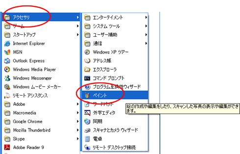 「スタート」ボタンから→「すべてのプログラム」をポイント、そのまま「アクセサリ」をポイントして出てきたサブメニューの中から「ペイント」をクリックします。