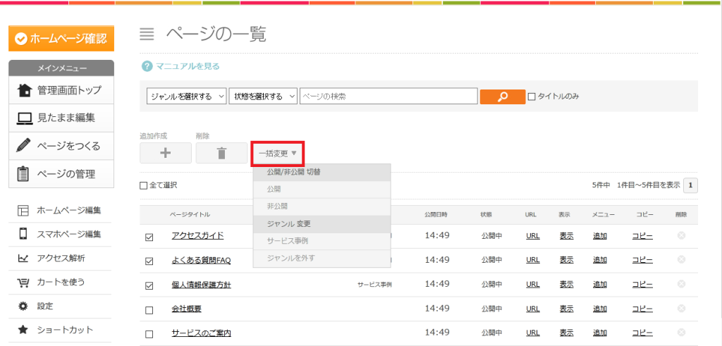 - 「ページの管理」より変更したいページのチェックボックスを選択し、一括にて変更ができます。