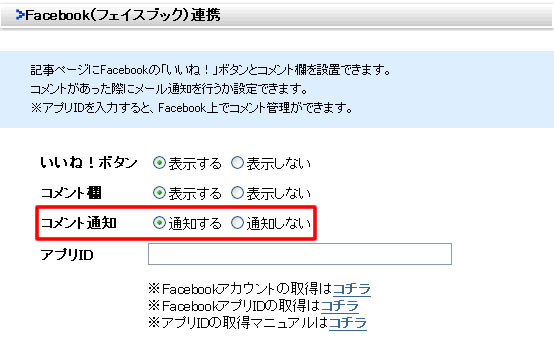 | Facebookコメント通知の設定 |