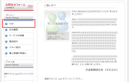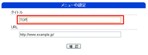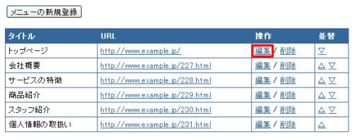 管理画面の「マイコンテンツ」→「メニューの編集」を選択します。 タイトルが「トップページ」の「編集」をクリックします。 下図の「タイトル」を編集します。※下図は、「トップページ」から「TOP」に変更する例です。 ホームページを確認すると、左メニューに「TOP」が表示されています。