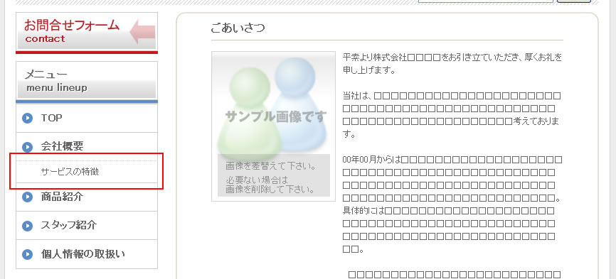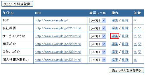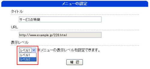 管理画面の「マイコンテンツ」→「メニューの編集」を選択します。 タイトルが「サービスの特徴」の「編集」をクリックします。 下図の表示レベルで「レベル2」を選択します。 表示レベルとは?表示レベルとは、以下のレベル1とレベル2の見え方をするメニューの表示方法です。レベル1・・・今までのメニューと同様の表示ですレベル2・・・レベル1の子メニューに見えるスタイルで表示されますホームページを確認すると、左メニューの「サービスの特徴」が表示レベル2のスタイルで表示されます。
