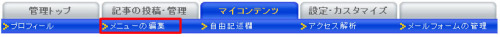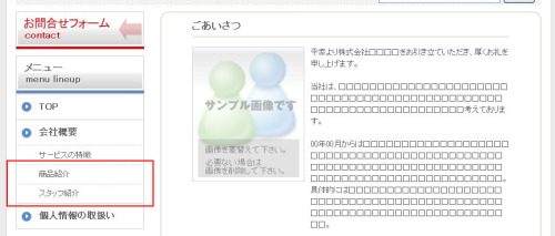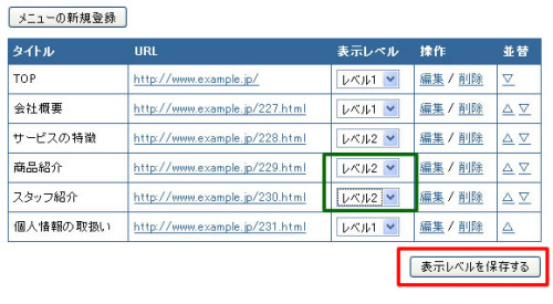 管理画面の「マイコンテンツ」→「メニューの編集」を選択します。 各メニューの表示レベルを選択し、一覧の右下の「表示レベルを保存」ボタン(下記画像赤枠)をクリックして設定します。※下記画像では、タイトルが「商品紹介」と「スタッフ紹介」の表示レベルにて「レベル2」を選択(緑枠)しています。 ホームページを確認すると、左メニューが設定した表示レベルのスタイルで表示されます。