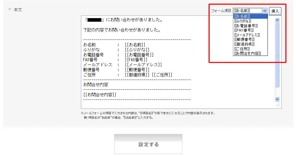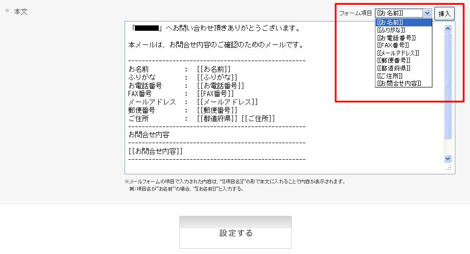 本文の任意の位置にカーソルを置き、以下の赤枠部分で項目を選択し、「挿入」ボタンをクリックするとフォーム項目値を設定できます。