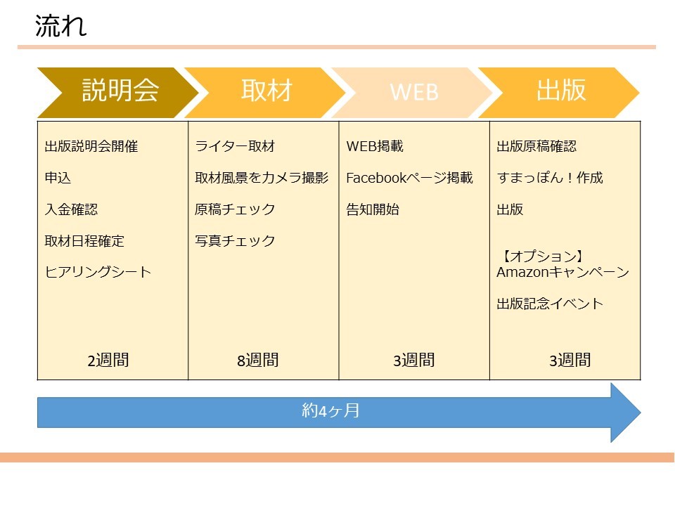 説明会>取材>WEB>出版と約4ヶ月で、本ができあがります。