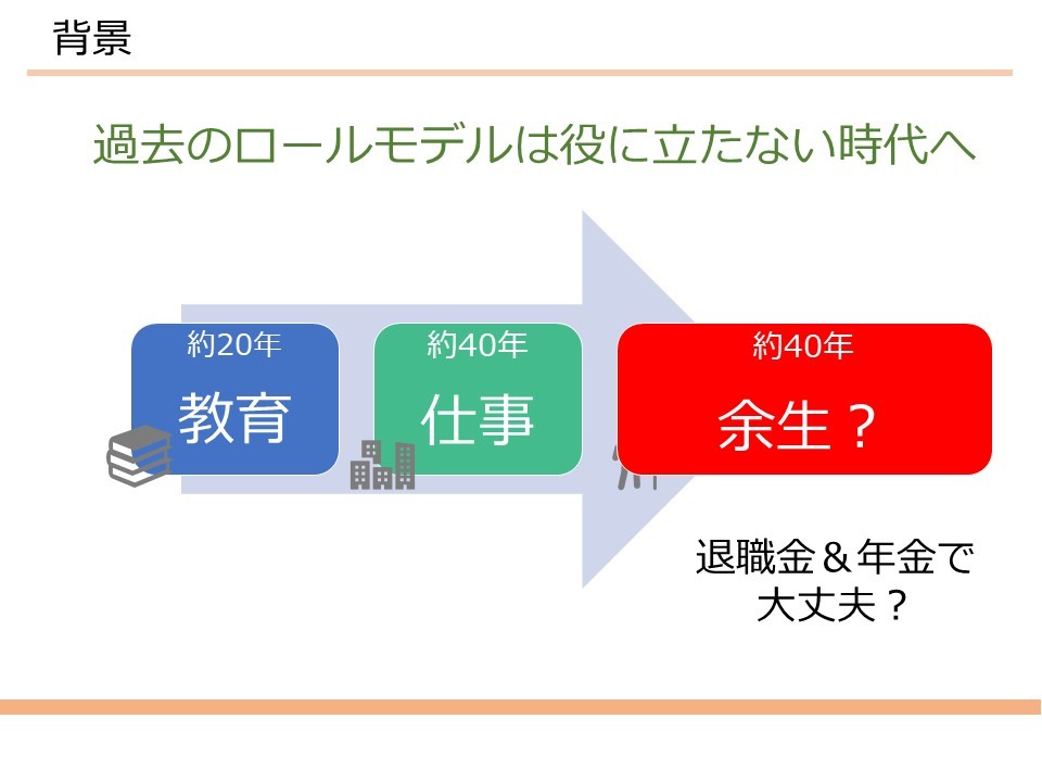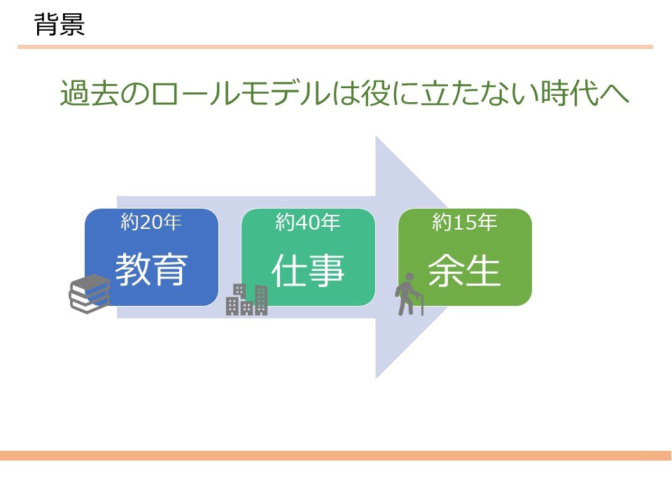また、大学教育で身につけたスキルが、40年ぐらいであれば、なんとかなった一世代前から、技術の進歩は早くなり、しかも仕事自体を60年70年としていく中で、一つの技術では、到底役に立たなくなってくるのではないでしょうか?