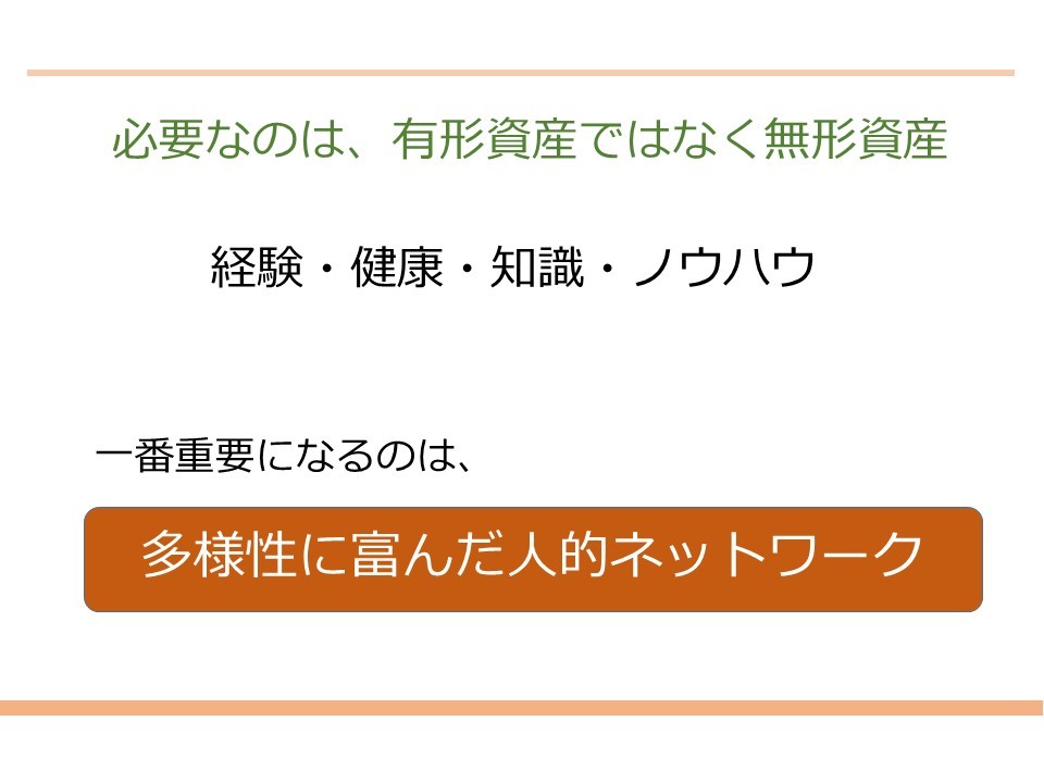 また長い人生を生き抜くためには、有形の資産(土地・建物・貯金)などではなく、経験や知識ノウハウそして、健康が必要になってきます。