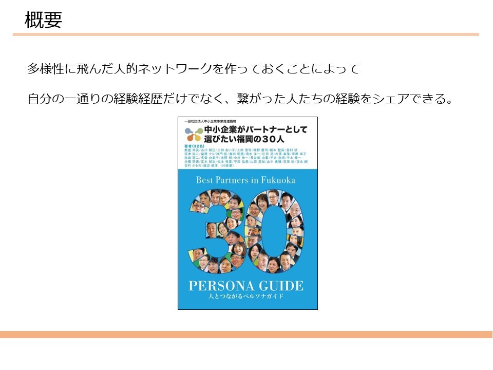 ここで、多様性に飛んだ人的ネットワークとは、いろいろな人生を歩んできた人とコミュニケーションをとりネットワークをつくることで、それぞれの経験やノウハウをシェアできるということです。