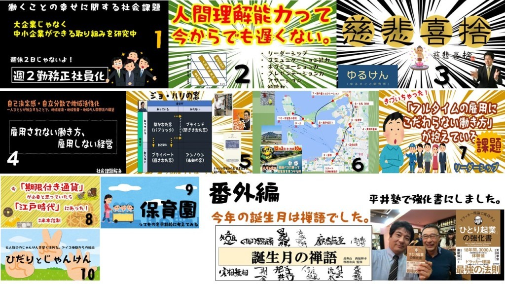 さて、どんな振り返りをしたかというと、今回の全講座を聞き終えて2ヶ月半で9名の講師そして、そこで紹介された書籍 (そんなにたくさん本を読む方でないが) 今回はたくさん読んだ。まだ、積んである本もたくさんありますが。。。かなりの情報をインプットした。なのでまだ処理が追いついていないのが、本当のところ。毎回講座ごとに振り返りをしているのも、自分の頭を整理するため。