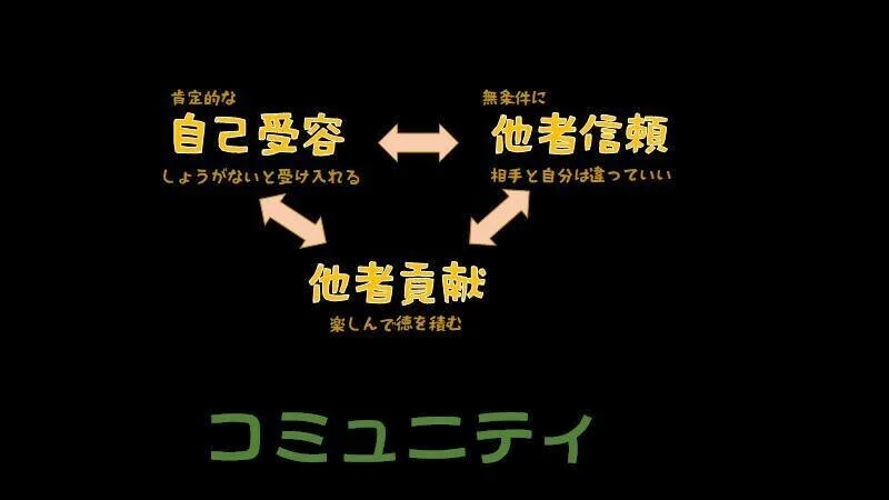 そこで、一番私につながっていて、納得したのが「自己受容」「他者信頼」「他者貢献」の関係