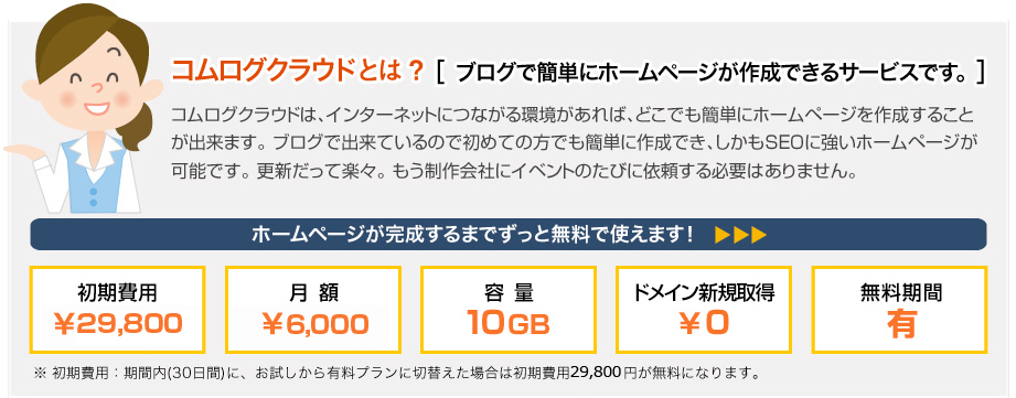コムログクラウドは、ブログを利用したホームページ作成サービスです。 ブログを書くように簡単に、誰でもホームページを作成することができます。