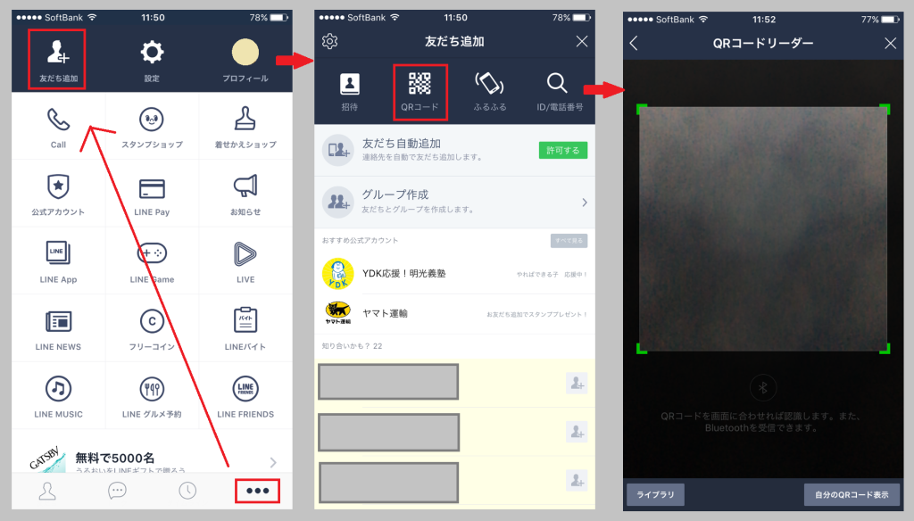 「…(その他) > 友達の追加 > QRコード」と画面を移動していくと、QRコードリーダーが起動します。
