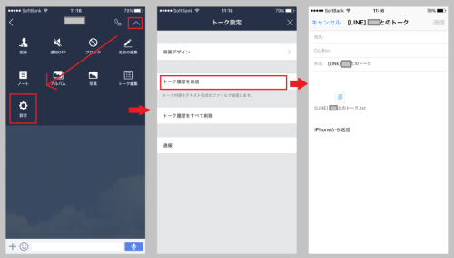 「右上のメニューボタン > 設定 > トーク履歴を送信」と画面を移動し、メールを送信すれば履歴を保存することができます。