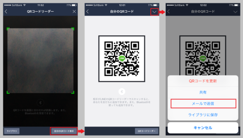 「自分のQRコード表示 > 右上のメニュー > メールで送信」と画面を移動し、メール送信の画面となりますのであとは送信するだけです。