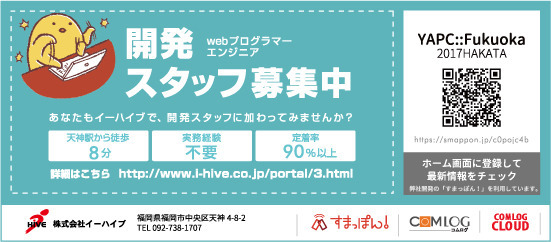 イーハイブでは、サービスの構築の際にPerlを用いて開発を行っております。 福岡でのPerlコミュニティの Fukuoka.pm には、元弊社スタッフだったメンバーが多く参加しており、その流れで、福岡のコアスタッフの一員になった次第です。