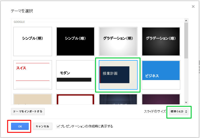 3.テーマやスライドのサイズ(緑枠)を選択し、「OKボタン(赤枠)」をクリックします。