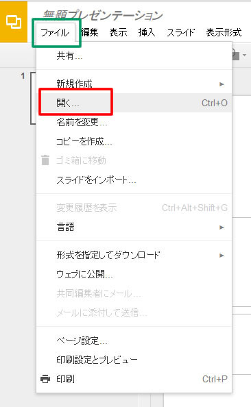 2.「ファイル(緑枠)」をクリックし、「開く(赤枠)」をクリックします。
