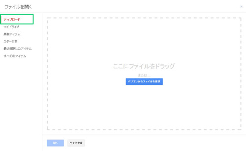 3.「アップロード(緑枠)」を選択し、破線枠内でファイルを選択します。