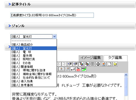「蛍光灯」というジャンルを作成したら、記事を作成するときに、その記事にジャンルを設定します。