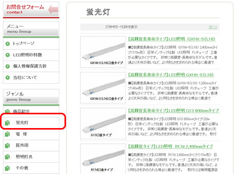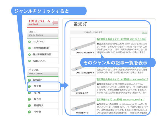 サイドメニューに表示された「蛍光灯」をクリックすると、「蛍光灯」というジャンルをつけた記事が