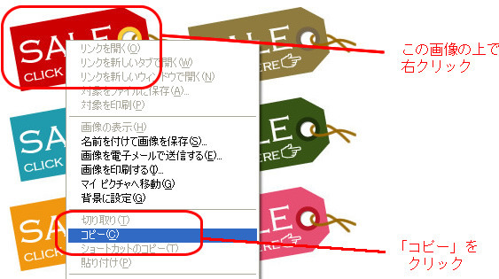 利用したい画像の上で右クリックをして、「コピー」をクリックします。