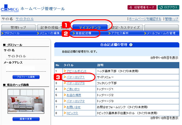 「マイコンテンツ」→「自由記述欄」をクリックします。