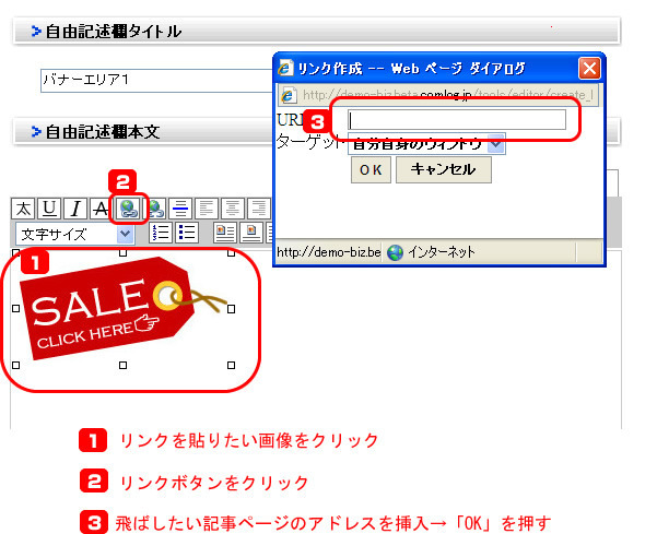 リンクを貼りたい画像をクリックして、下記画像の2のリンクボタンをクリックします。